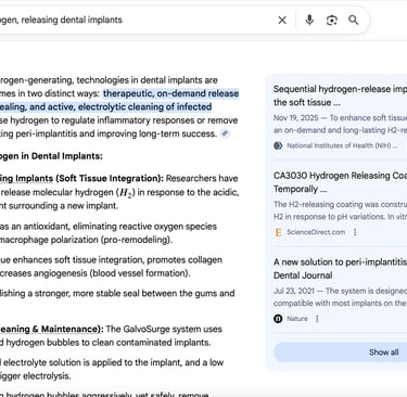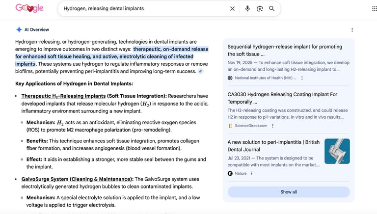 New research into hydrogen-releasing implants (published late 2025) suggests that MH can induce "M2 macrophage polarization." In simpler terms, it flips a switch in the immune system from "attack/inflammation" mode to "repair/remodeling" mode, which accelerates the healing of the gums and bone around the implant. These two screenshots confirm that molecular hydrogen is the cutting edge in modern dentistry.
