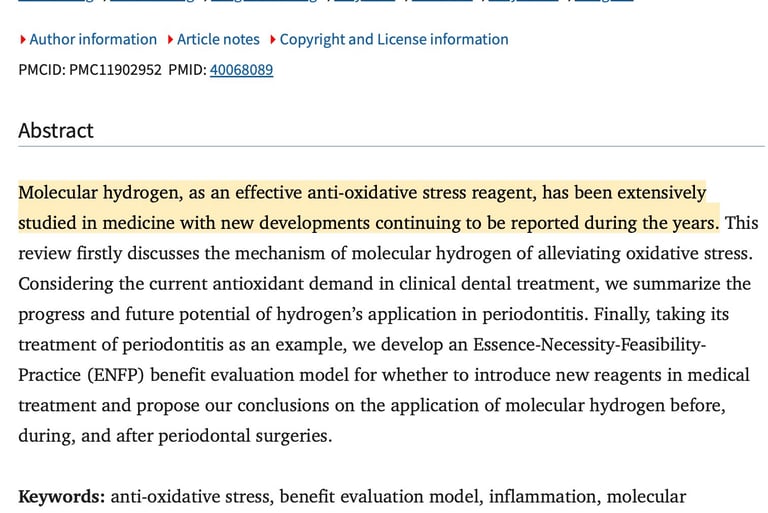 Integrating molecular hydrogen into oral surgery and implantology is a relatively new but scientifically grounded frontier. Research primarily highlights its role as a selective antioxidant meaning it neutralizes the most harmful free radicals (like the hydroxyl radical) without disrupting the beneficial ones our bodies use for signaling.