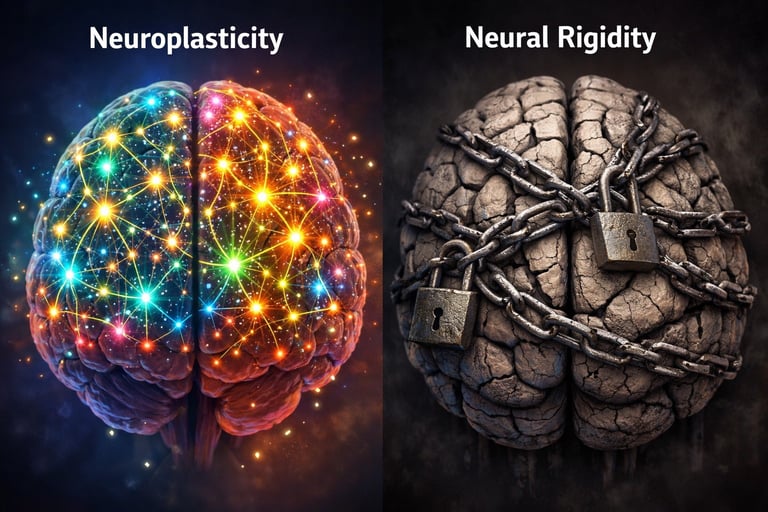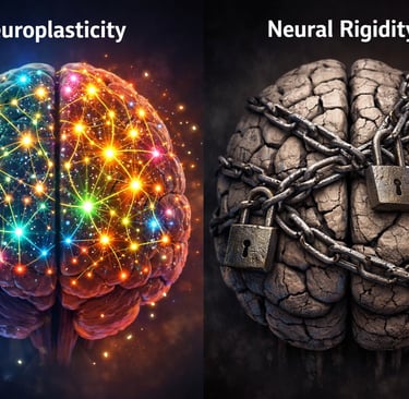 More specifically, neural rigidity involves fixed neural pathways circuits fire the same way over and over with little variation reduced synaptic remodeling fewer new connections, weakened pruning, limited strengthening of new pathways statelocking the brain gets “stuck” in a particular mode threat, depression, pain, habit. Lower adaptability learning is slower, recovery is harder, change feels effortful or impossible high energetic cost to change it takes a lot of input to shift states.