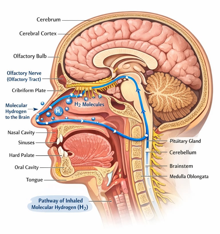 Pathway and Mechanisms of MH delivery to the brain via nasal cannula when MH is inhaled through a nasal cannula, it reaches the brain through two anatomically and physiologically plausible pathways direct nose to brain diffusion via the olfactory route. Indirect systemic delivery via pulmonary absorption and circulation both pathways are consistent with established principles of gas diffusion, nasal drug delivery research, and hydrogen pharmacokinetics.