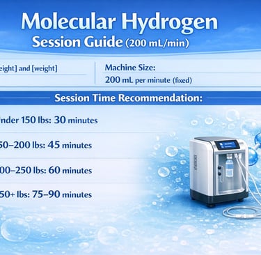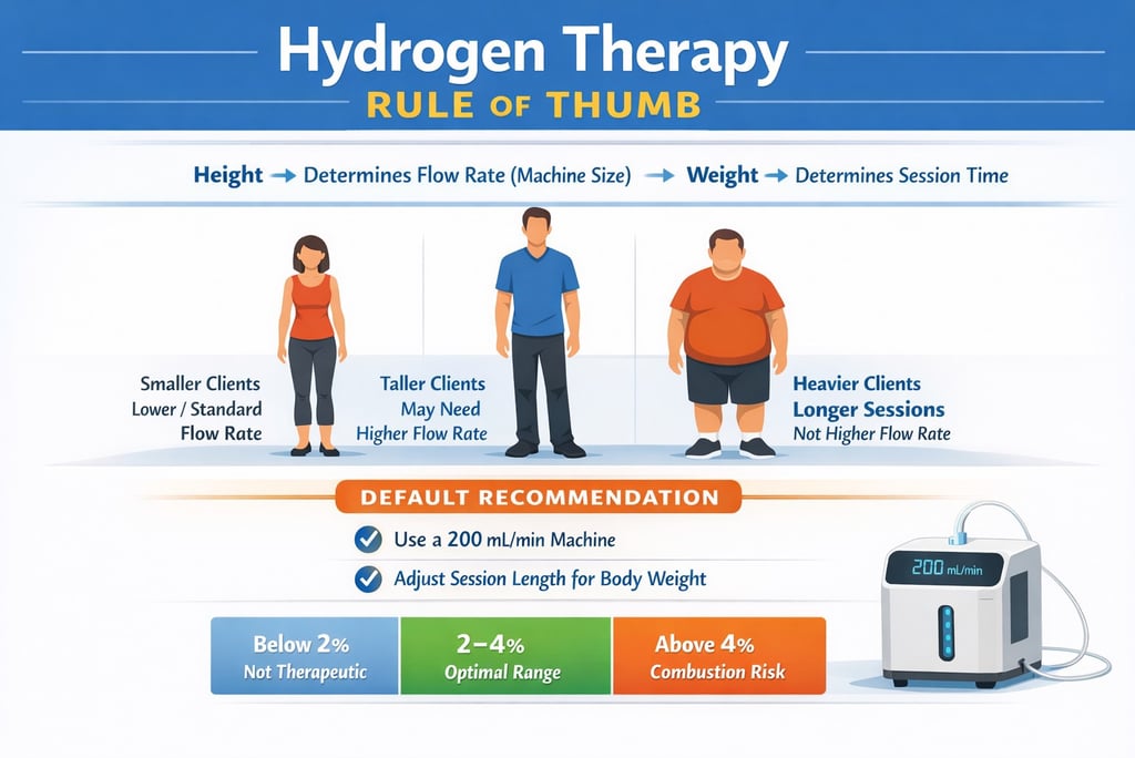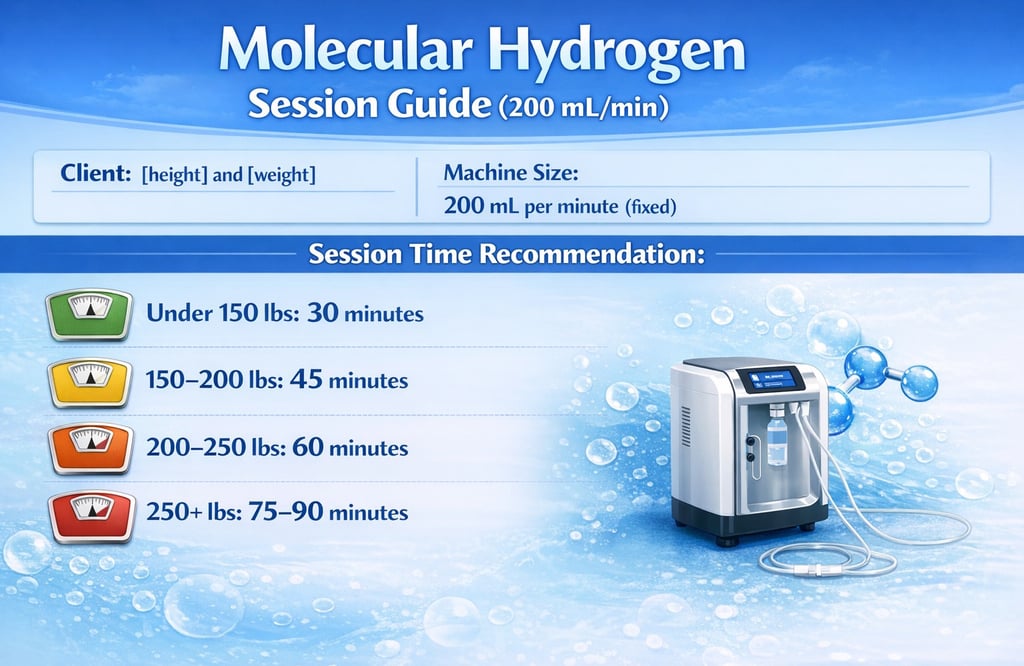Client is [height] and [weight]. I am using a molecular hydrogen machine size (200mL per minute), and how long should the session be? Keep hydrogen within 2–4%. Do not increase flow rate for weight—only adjust session time.