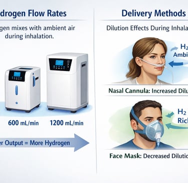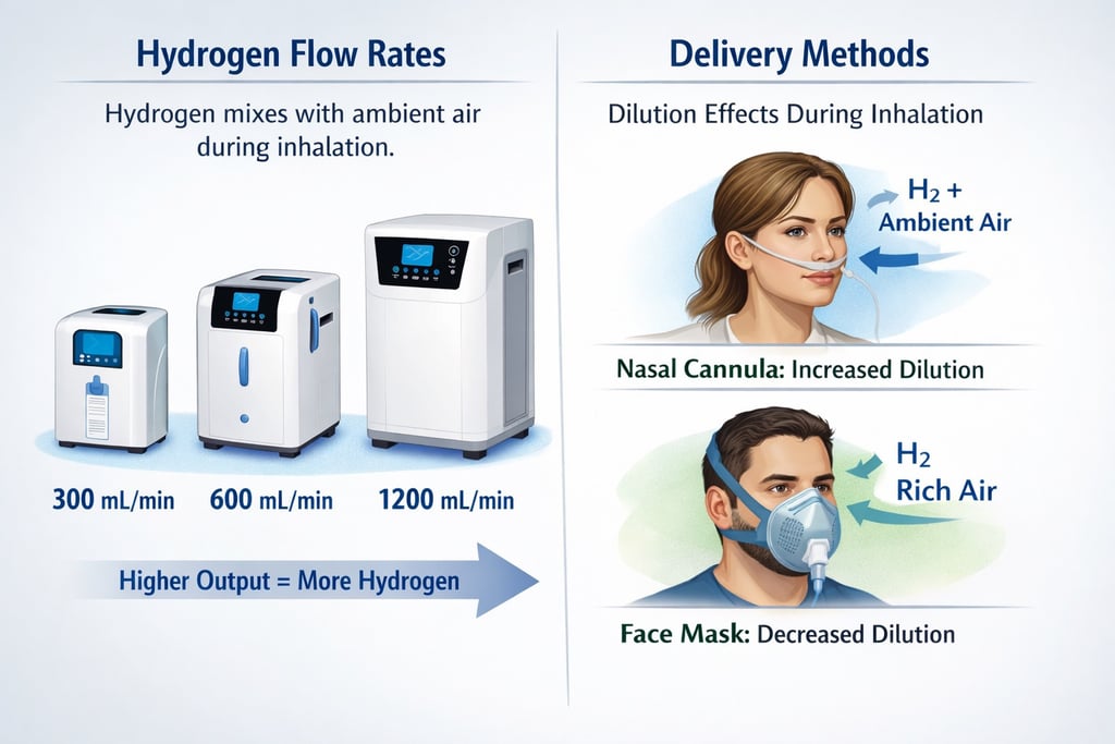 What About Higher Output Machines? Some devices produce 300 mL/min 600 mL/min or more does that mean they’re unsafe? Not necessarily because hydrogen mixes with ambient air during inhalation. The delivery method also matters (nasal cannula vs mask) this will affect dilution a mask covering the nose and mouth decreases the dilution a nasal cannula will increase delusion.