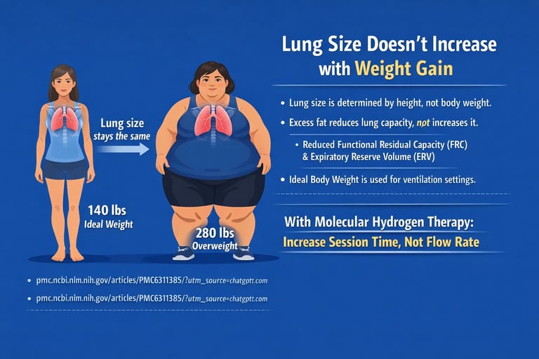 Studies consistently demonstrate reductions in key measures like functional residual capacity (FRC) and expiratory reserve volume (ERV) as weight increases, meaning the lungs operate at a smaller usable volume, not a larger one. This is why clinical settings use “ideal body weight” (based largely on height) rather than actual weight when determining ventilation—because lung size does not scale with fat mass. Applied to molecular hydrogen therapy and the 2–4% rule, this reinforces that flow rate should remain appropriate for the person’s lung size (their “ideal” physiology), and the only appropriate adjustment for larger individuals is increased session time, not increased concentration or flow.