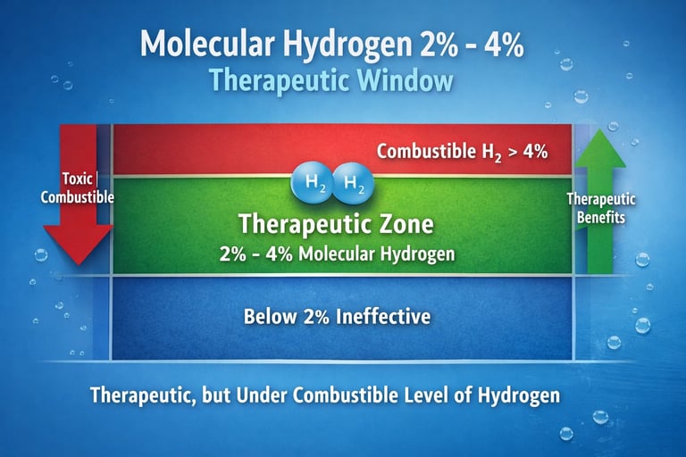 The 2–4% rule refers to the concentration of hydrogen gas in the air you inhale. Below 2% is not therapeutically effective 2%-4% is optimal therapeutic range. Above 4% enters the flammable range this range is critical because hydrogen behaves differently depending on concentration. At low levels, it’s biologically inactive, at optimal levels, it acts as a selective antioxidant. At higher levels, it becomes combustible in air.