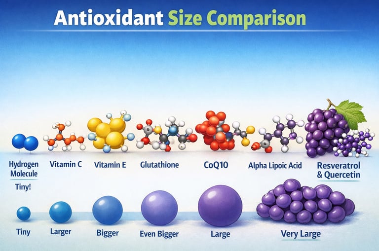 Molecular hydrogen is a unique antioxidant because of its size. As the smallest molecule in the universe, it can easily diffuse through cell membranes and enter the mitochondria and nucleus. Selective Targeting Unlike some antioxidants that neutralize all free radicals including the good ones used for signaling MH selectively targets the most cytotoxic toxic radicals, such as the hydroxyl radical OH. The bioavailability of MH It reaches areas that larger antioxidant supplements simply can't.
